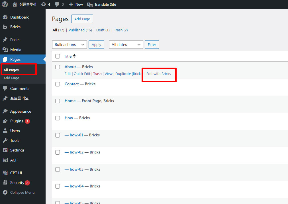좌측 관리자 메뉴에서 페이지 > 모든 페이지를 클릭하면 리스트가 나옵니다.