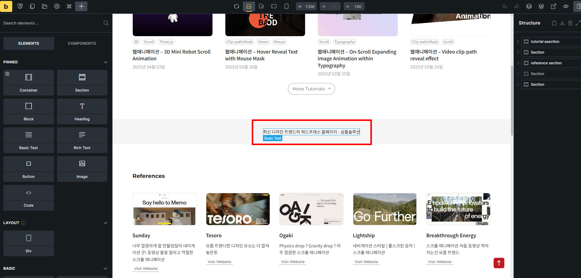 페이지 빌더에서 변경을 원하는 텍스트를 클릭하세요.