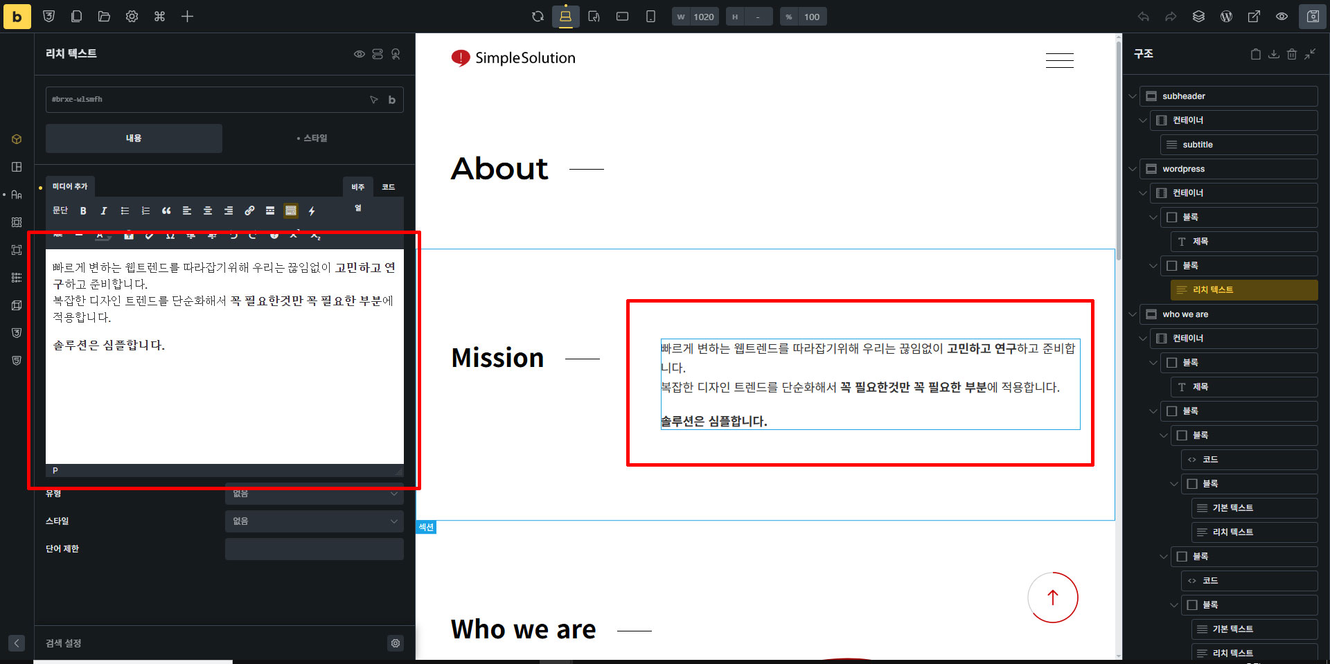 수정을 원하는 텍스트 부분을 클릭하면 좌측에 해당 텍스트 수정 모듈이 나옵니다.