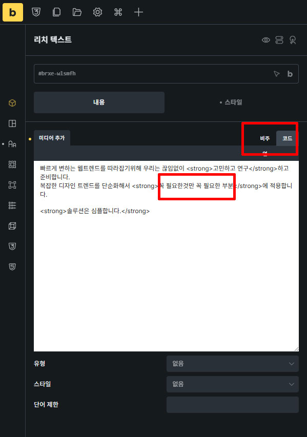 텍스트 수정은 반드시 탭에서 ‘코드’ 부분을 선택한 후 수정해주세요.