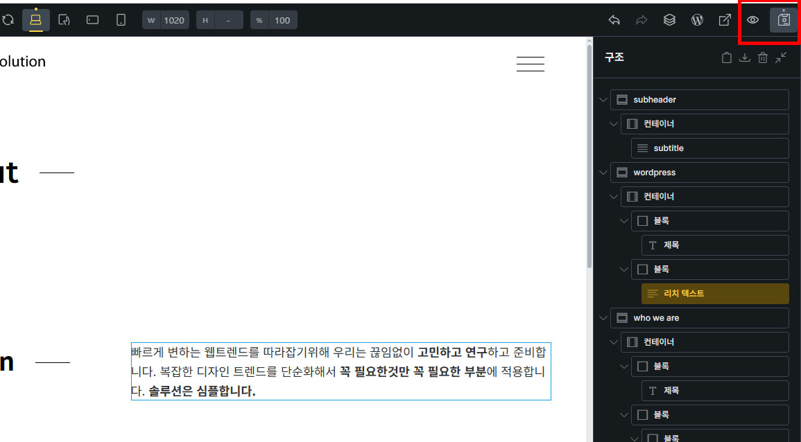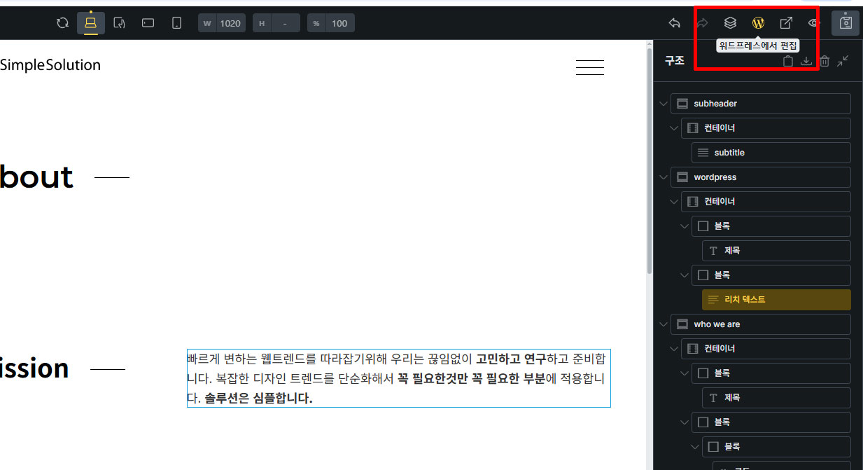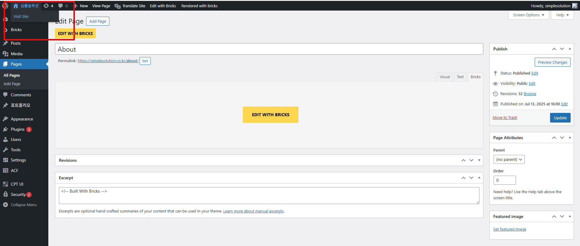 Edit with Bricks ( Bricks 로 편집 ) 을 클릭하면 빌더로 들어갑니다.