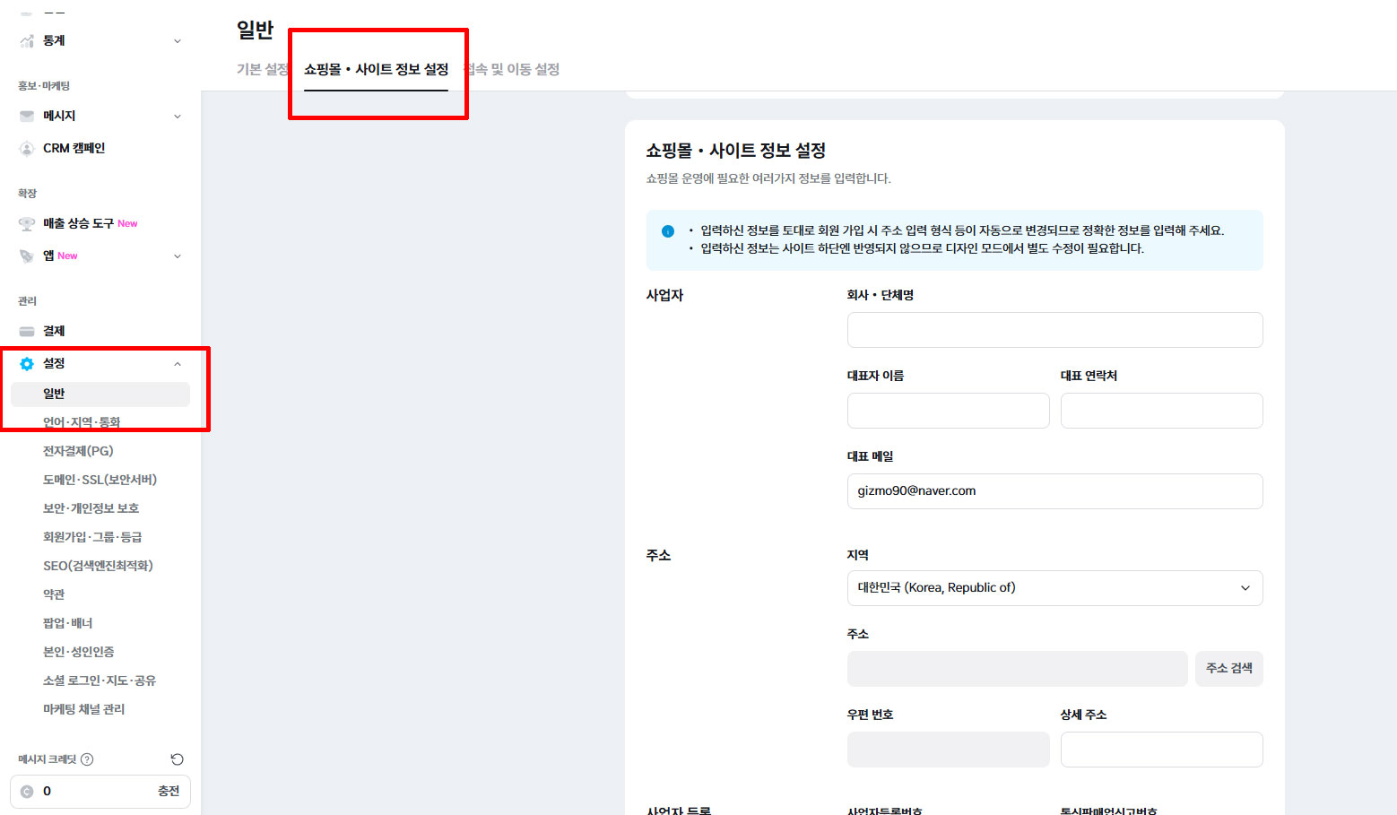 아래 설정 > 일반 에서 쇼핑몰, 사이트 정보 설정