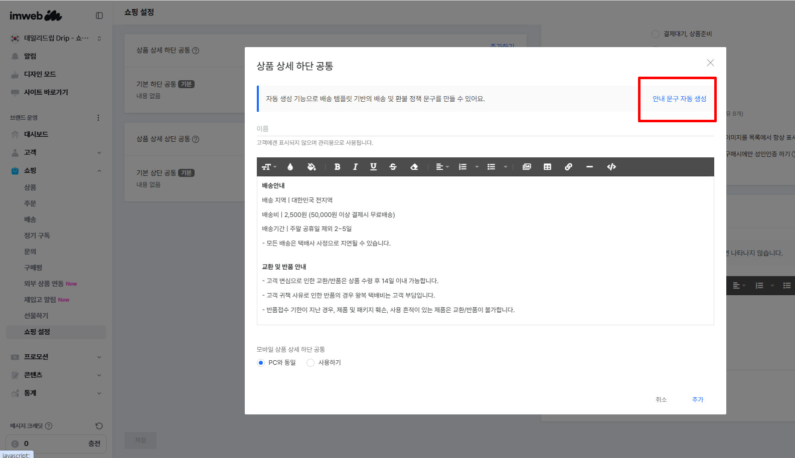쇼핑 > 쇼핑설정       상세하단 공통 추가하기 클릭 > 안내문구 자동생성해서 추가  > 우측 상단 저장